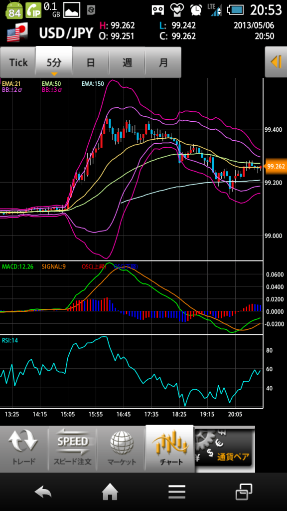 ドル円ショート FX・株・投資 X 2013.05.06 投稿した通りの値動きになりましたね。 この後のヤンキーでどうなるかと言った所です。 99.23で半分利食いしました。 また.45まできたらストップを置いてナンピン します。 そのまま下がっていくなら.10近辺で一旦利食いします。 99円を割り込む動きも普通に有るとおもいます。 現在のチャートはこれ gmoクリックより