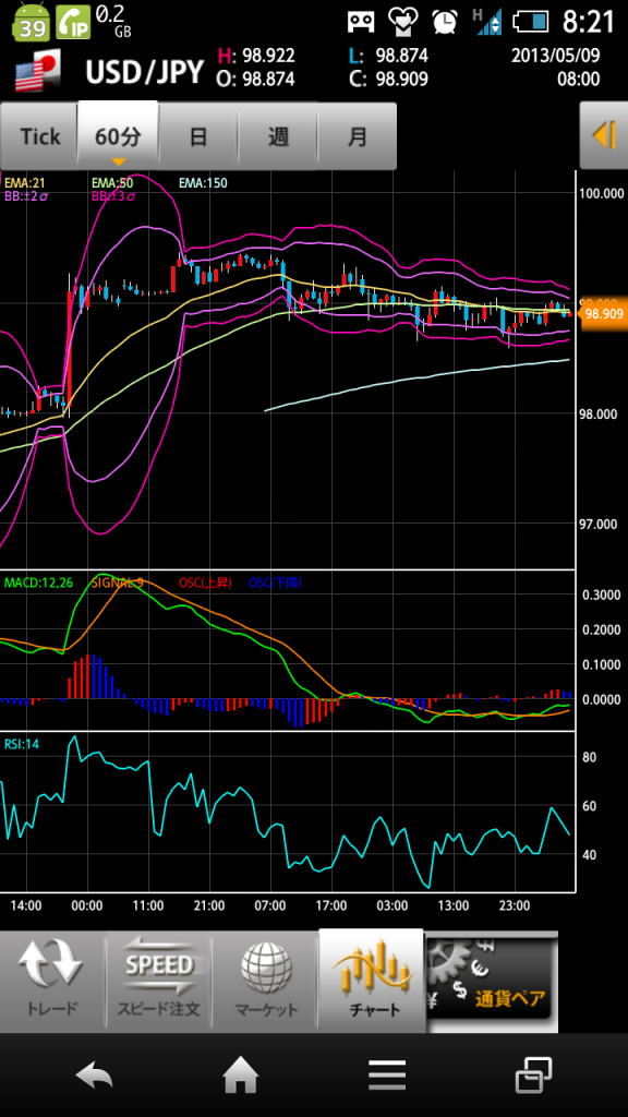 ドル円長ーいペナント FX・株・投資 X 2013.05.09 1時間足下降トレンドにも見えますが持ち合いを 上抜けているようにも見えます。 なのでとりあえず押し目の98.90でロングしました。 強い上昇とは思えませんが軽く上に抜けそう な気がします。利確はどこにしましょうか。