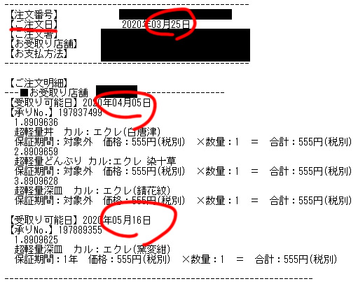 他の商品は4月5日になっていますので最初は『店頭受け取り10日も待つのか、長いな~』と思っていたのですが、お店に行って受取商品数が少ないので注文詳細を見たら5月16日の物が有ってびっくりしました。