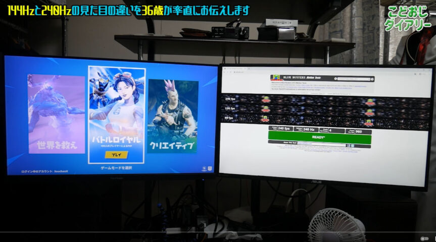 今回は27インチ同士で左のviewsonicの144Hzのモニタと右のASUSの240Hzのモニタで比較しました。