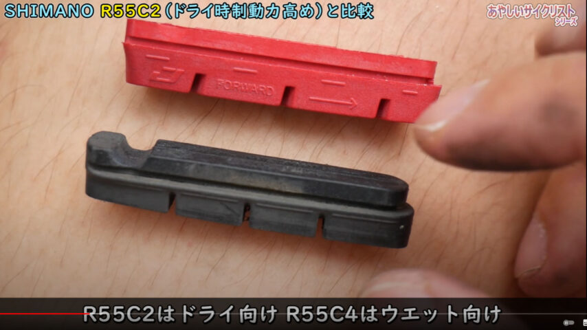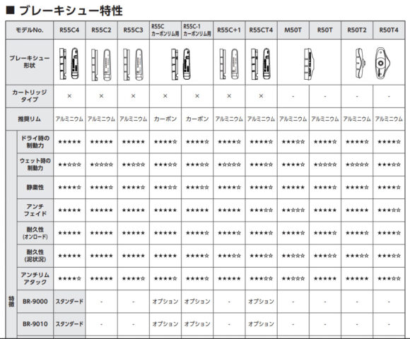 私が今回比較したシマノのシューはR55C2という一番ウエット性能が低い物で5段階で★1評価、とは言え一番一般的なR55C4でも★2評価、一番評価の高いアルミ用のR55CT4でも★3評価、R55CT4が欲しくなるのですがどこにも売ってない(これはなぜ)