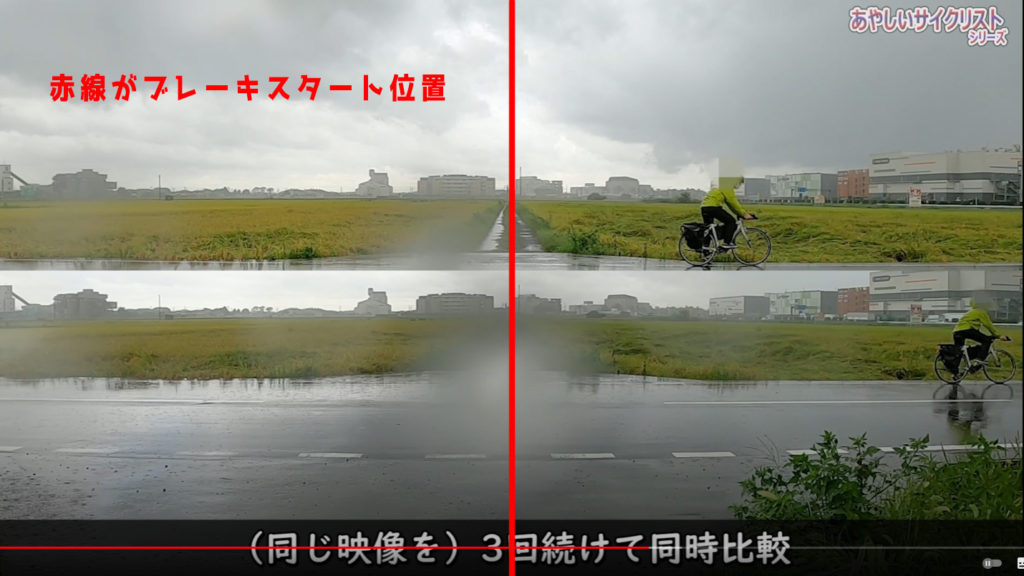 エクストリームウェザーの状況で赤い線の位置でブレーキをして比較します、速度は時速20~25キロ。