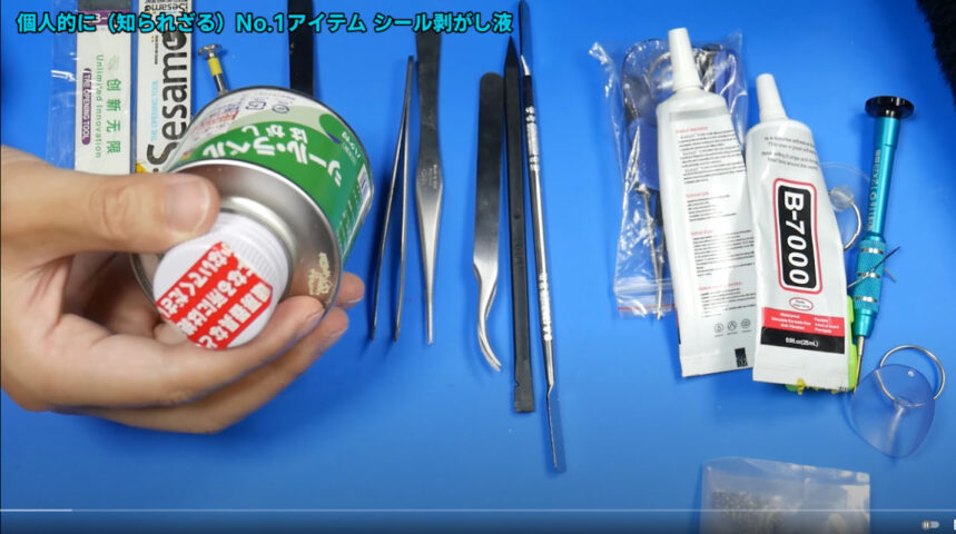 まずは一番のお気に入り、左手に持っているシール・ラベルはがし液、こいつは画面交換時に限らずバッテリーを外す時や両面テープでとめられている各パーツを外す時に部品を壊したり傷つける事なく剥がせるので大変重宝します。