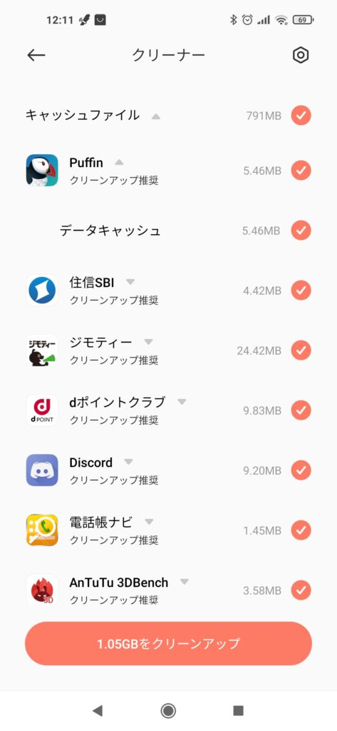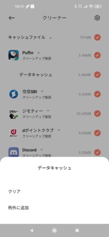 キャッシュファイルを選ぶとキャッシュをクリアできるアプリが出てきます、ChMateは既に設定済みだったのでPuffinを設定してみます、タップするとデータキャッシュというのが出てくるのでそれをタップ