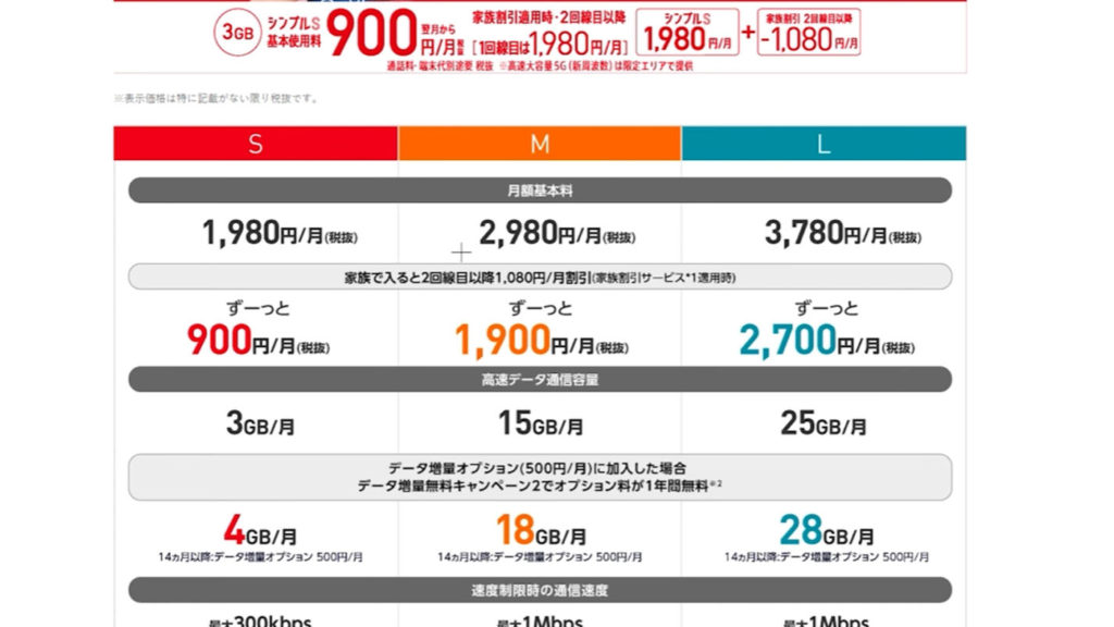 3GBじゃ足りないという人だと15GBのシンプルMが2,980円を選ぶことになります、家族割りで1900円ですが間を取って2,500円とします。