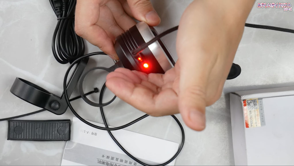 本体からケーブルが出ていて先にボタンが付いています、ボタンはゴムバンドと一体になっています(チープなライトにあるタイプの留め方)
