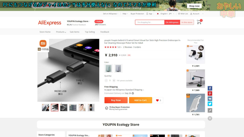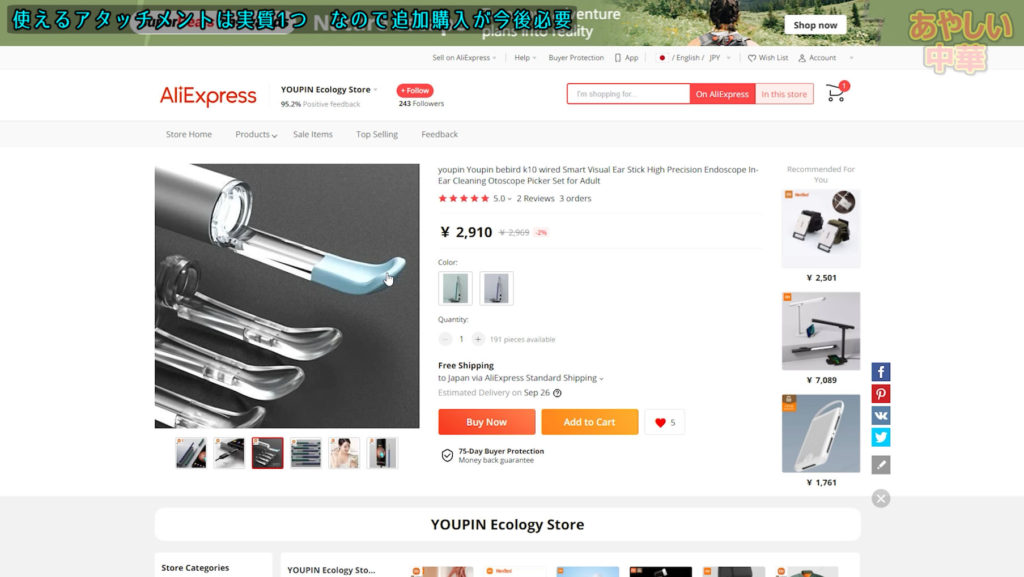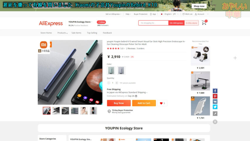 YoupinというXiaomiの子会社が出しているBebirdという耳かきシリーズの中から(多分)唯一の有線タイプであるK10を購入しました。