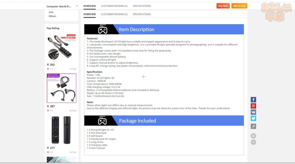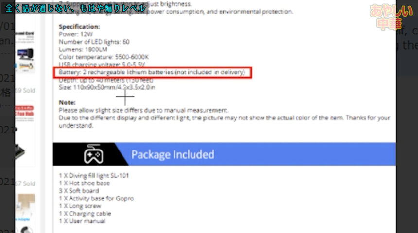 しかしここでも『 2 rechargeable lithium batteries (not included in delivery)』のスクリーンショットを貼ってくる、駄目だこりゃ。