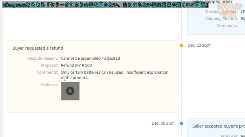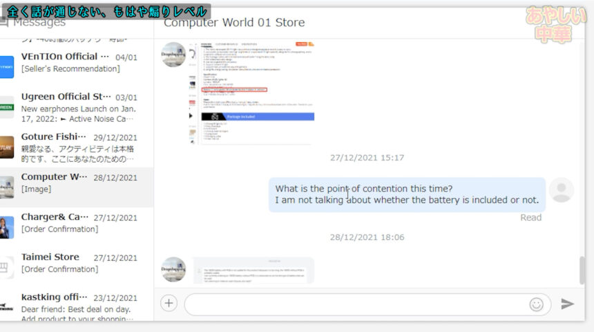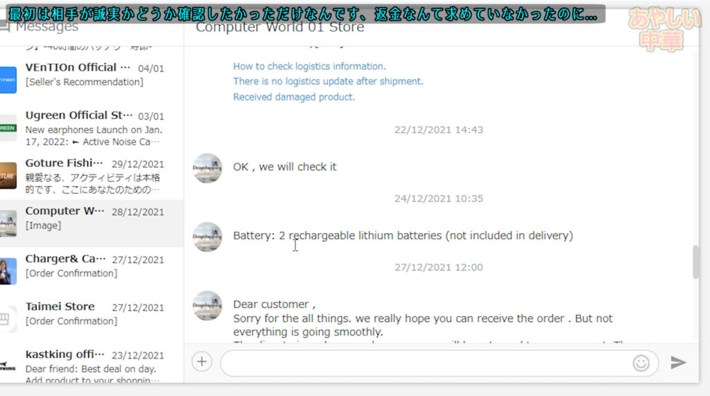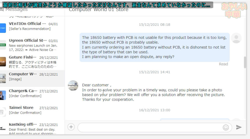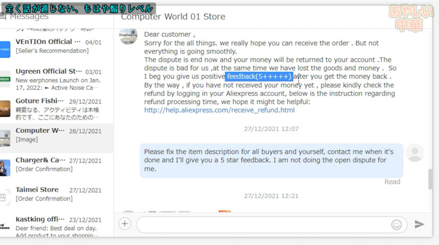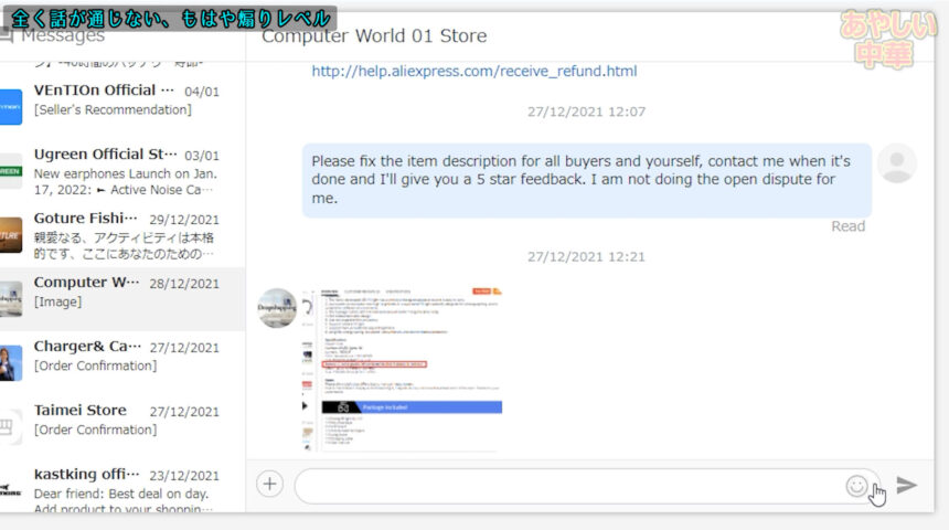 最初は返金を求めるつもりは無く、単純に説明欄にその事を書いてない事は不親切であるという主張をして相手の誠実度を測る為にメッセージを送りました。