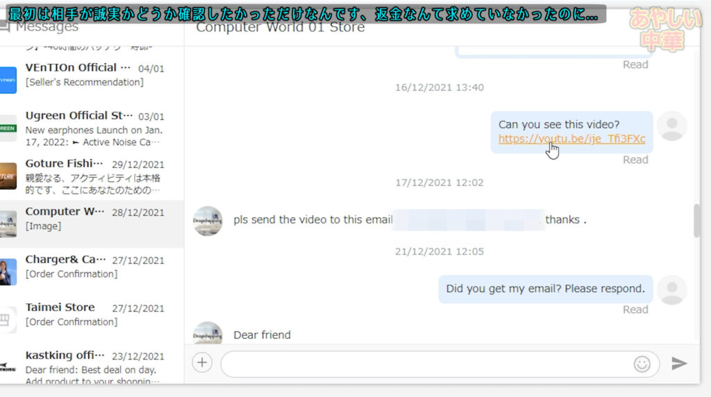 写真を送れと言われたのでまずはyoutubeに限定公開動画をアップロードしました、しかし相手が中国住だからでしょうメールに送ってほしいと言われ、メールで動画を送りました。