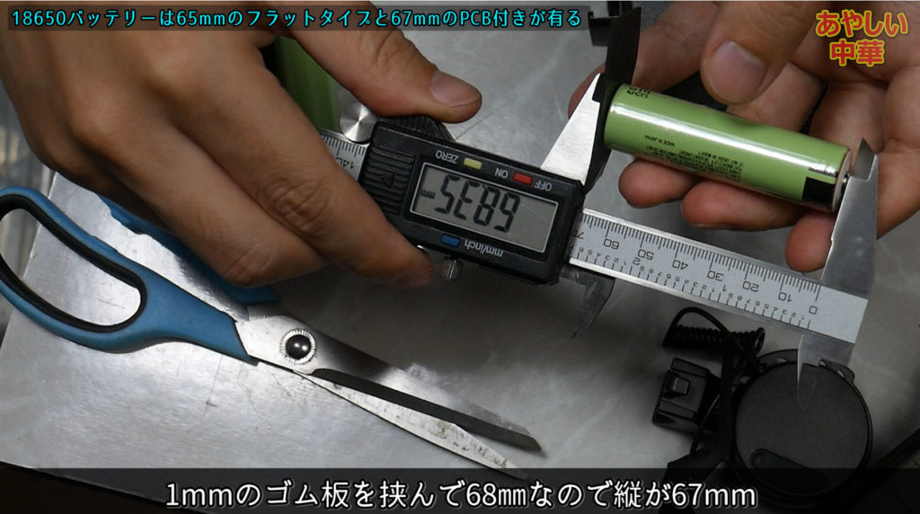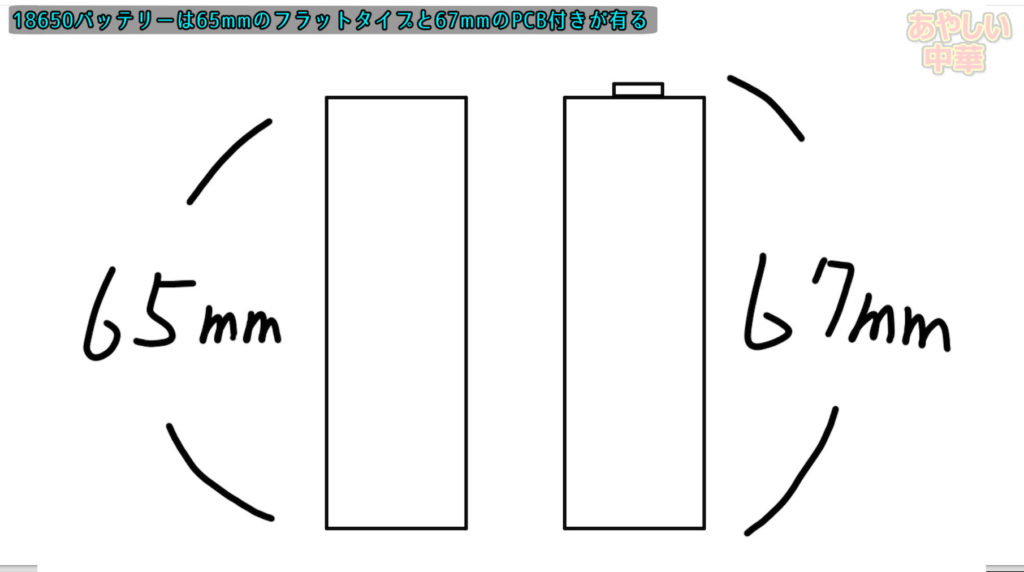18650はPCB付きと無しが有ってaliexpressで売ってる物を調べると有りが縦67㎜、無しのフラットタイプが65㎜の様です、因みに18650は幅が18mmで高さが65㎜だから18650なのです。