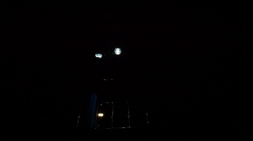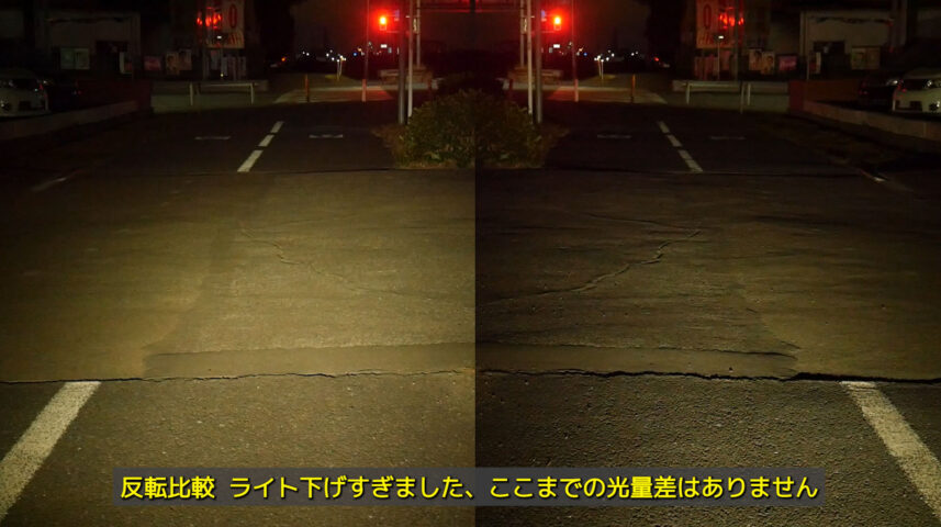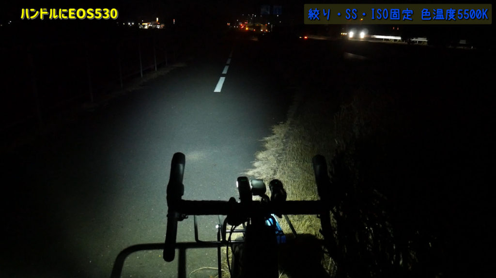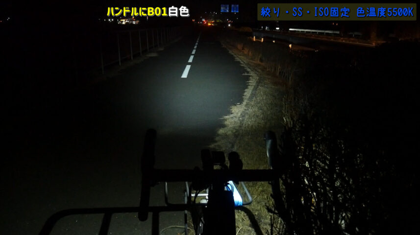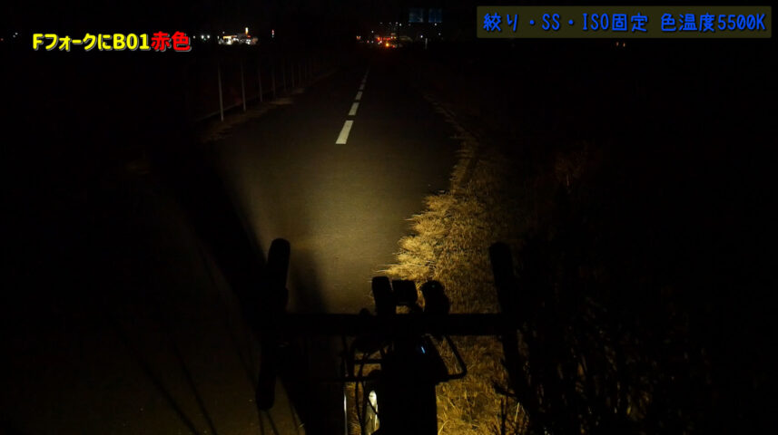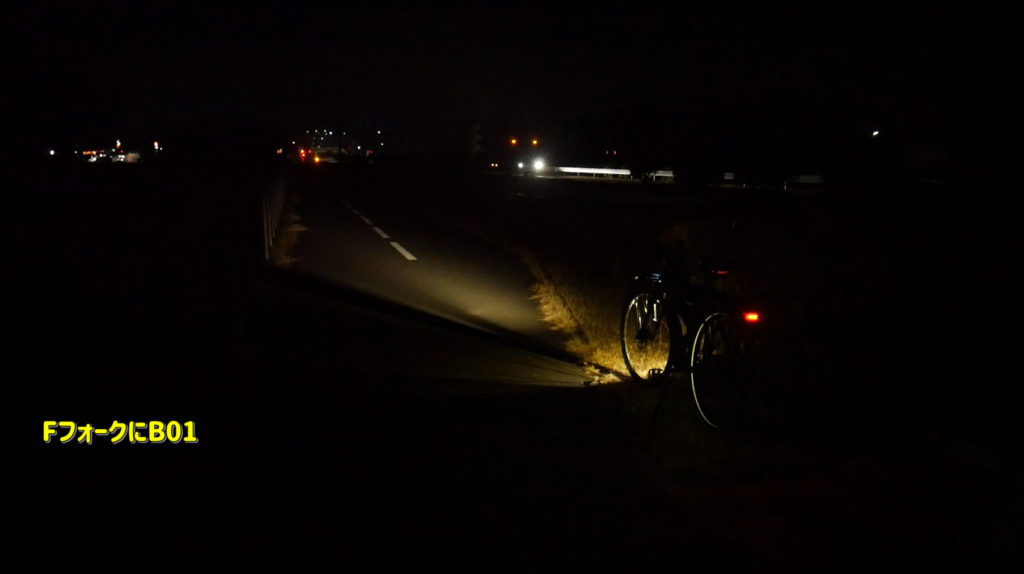 ハンドルに付けた方が対向者が眩しくないギリギリ上に振っているのに対して、Fフォークの方は比較的下側に低く振っているのであまり参考になる写真ではありませんが一応掲載します。