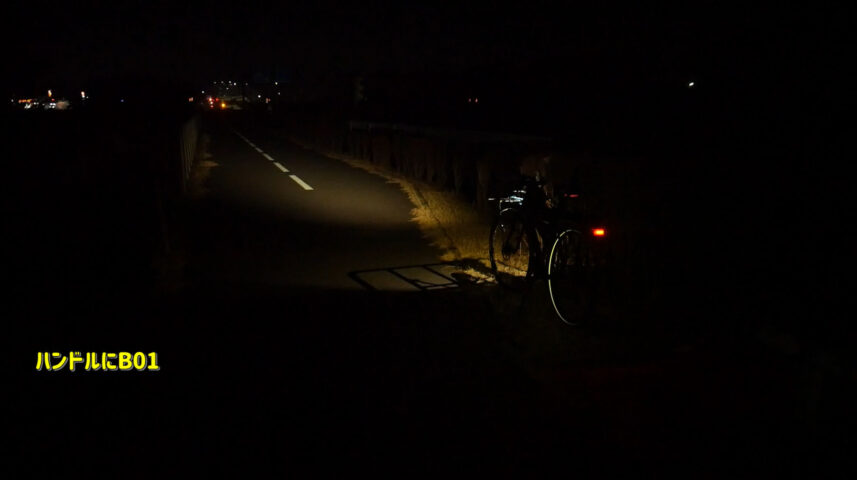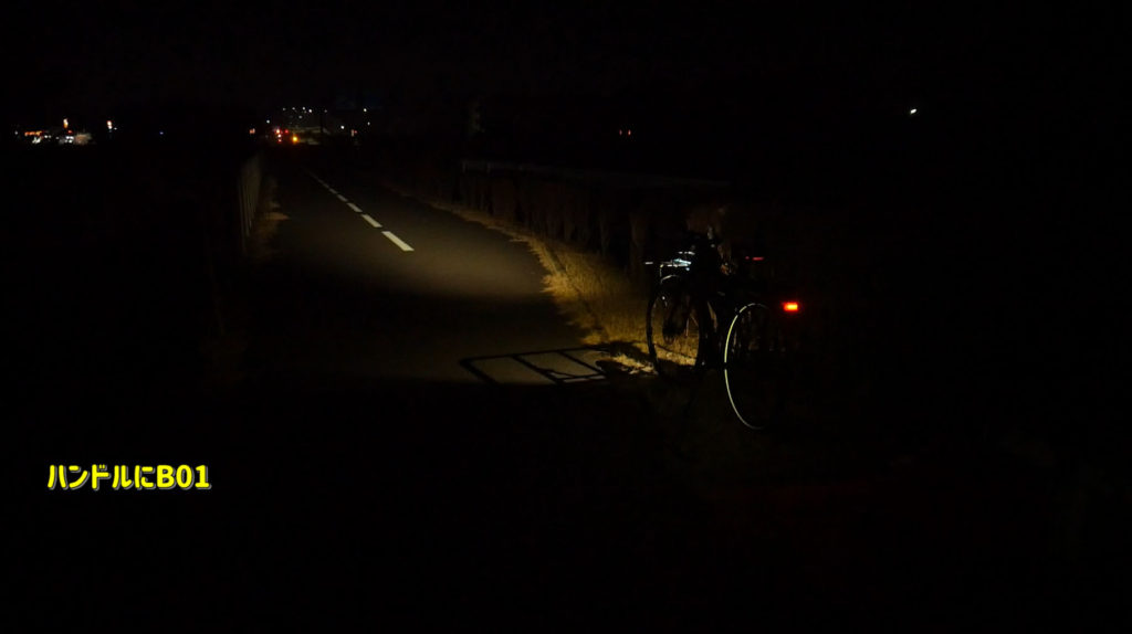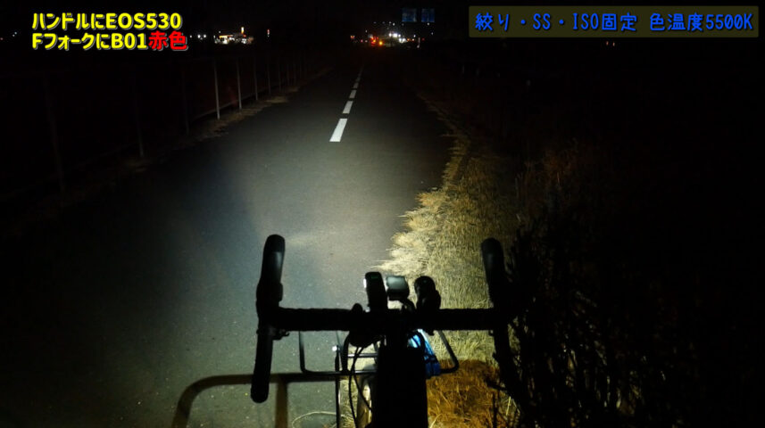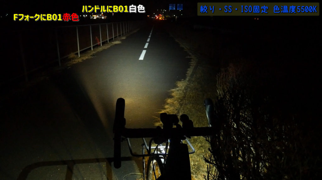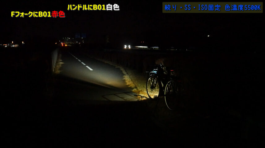 下の2枚がハンドルに付けた場合とFフォークに付けた場合の比較です(どちらも赤色LEDのB01)