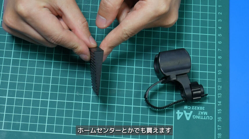それをドアストッパーで小さく角度を付け、自己融着テープで更に角度とすべり止めの土台を作ってあげる事で角度と強度を得る事ができます。