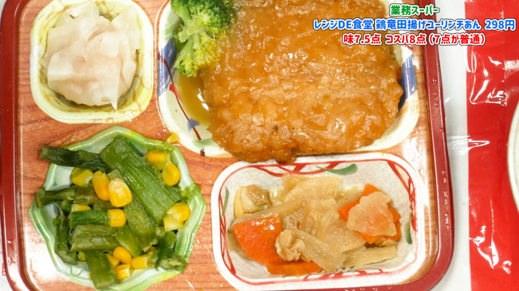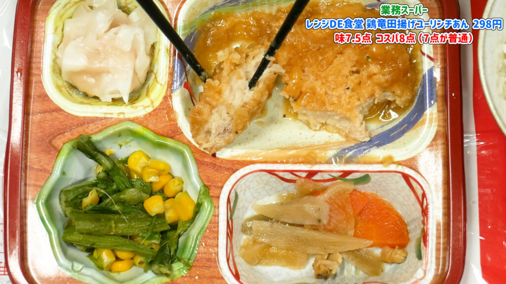 油淋鶏がユーリンチーらしいかというと冷凍なので衣がグズグズになってしまって「らしい」とは言えませんが、肉は箸でも切れる位よく調理してあって味自体は美味しいのでこれがいつでも(冷凍)食べれて副菜がまぁまぁで298円なのを考えるとコスパは高いのかなと思いました。