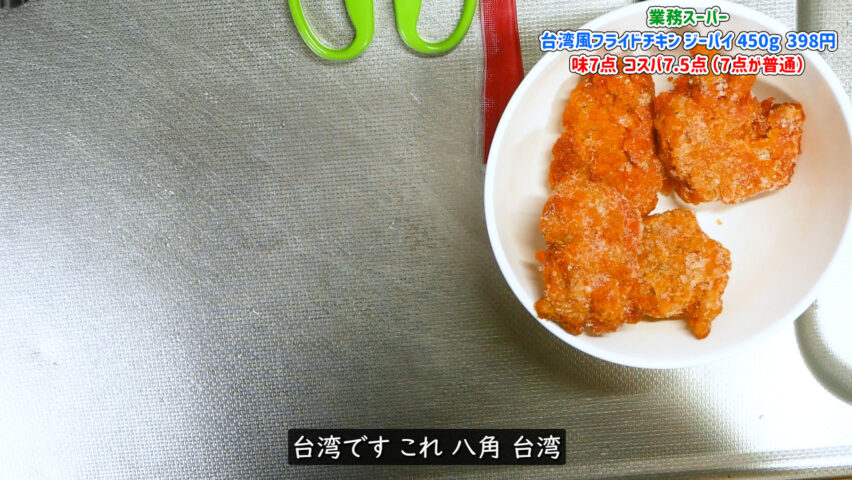 裏面の原材料名を見る限り日本人向けの見えます、香辛料とあるのですが台湾風フライドチキンと書いて有るのでKFC(ケンタッキーフライドチキン)のオリジナルスパイスを想像しますが実際は八角の香りの強い台湾味のフライドチキンになります。