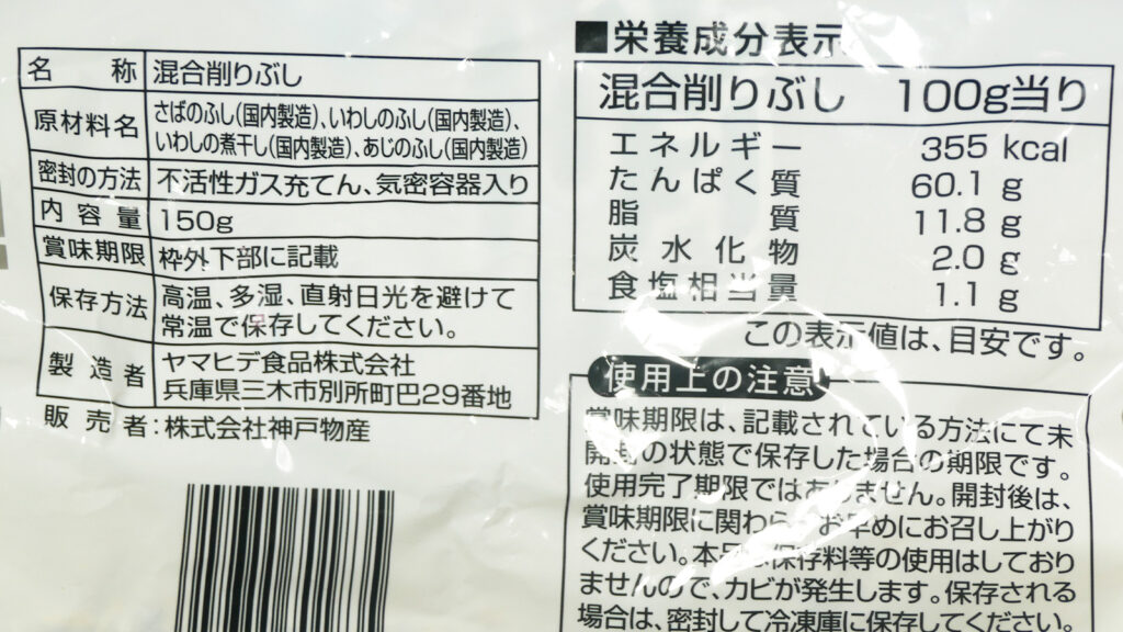 と、ここまでは思っていたのですがyoutubeに投稿後視聴者さんから『混合はかつお100%じゃない』というご指摘を頂きました、混合というのは複数の魚の削り節を混ぜ合わせたものと言う事で今回の混合は以下の様に「サバ」「イワシ」「アジ」の混合でかつおは入ってすらいなく、今回1つ勉強しました。