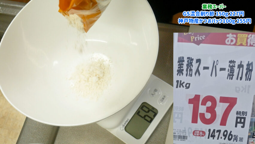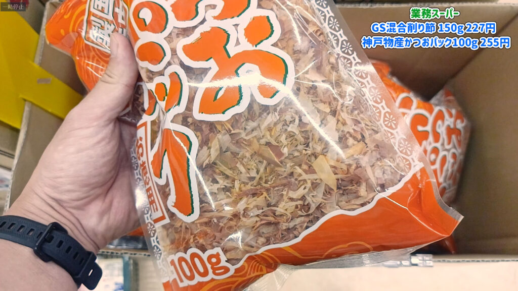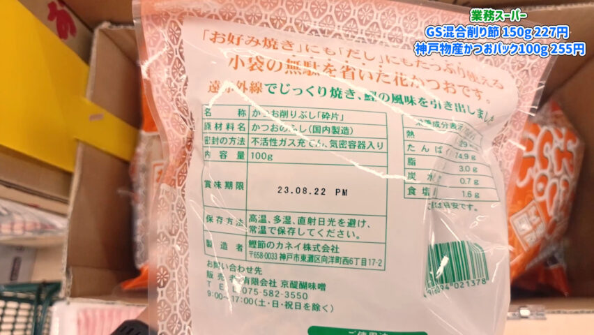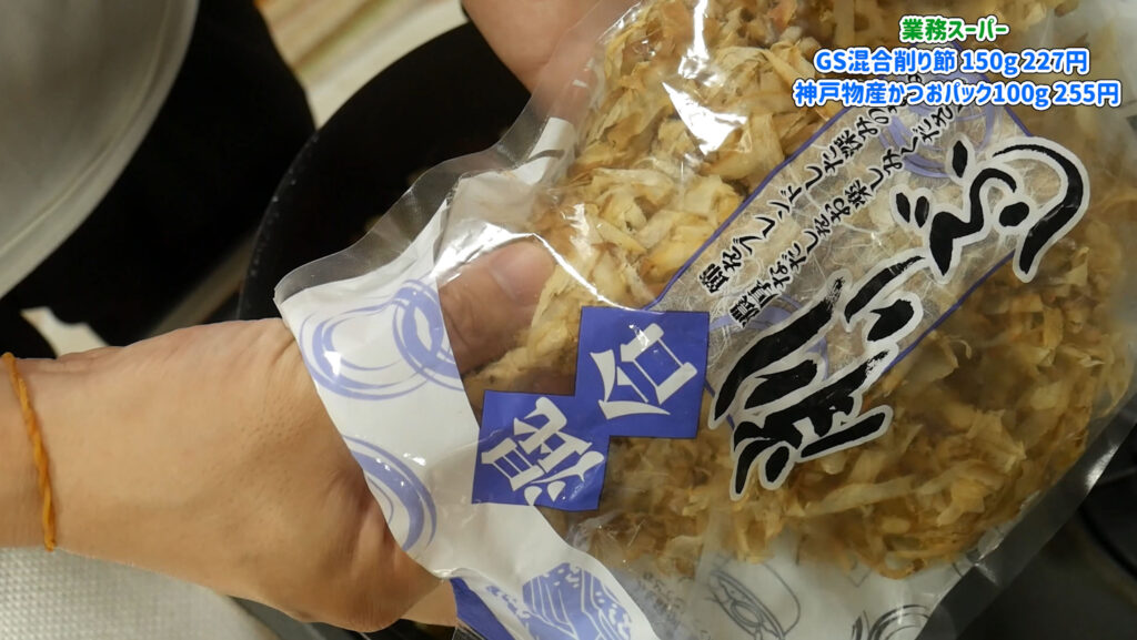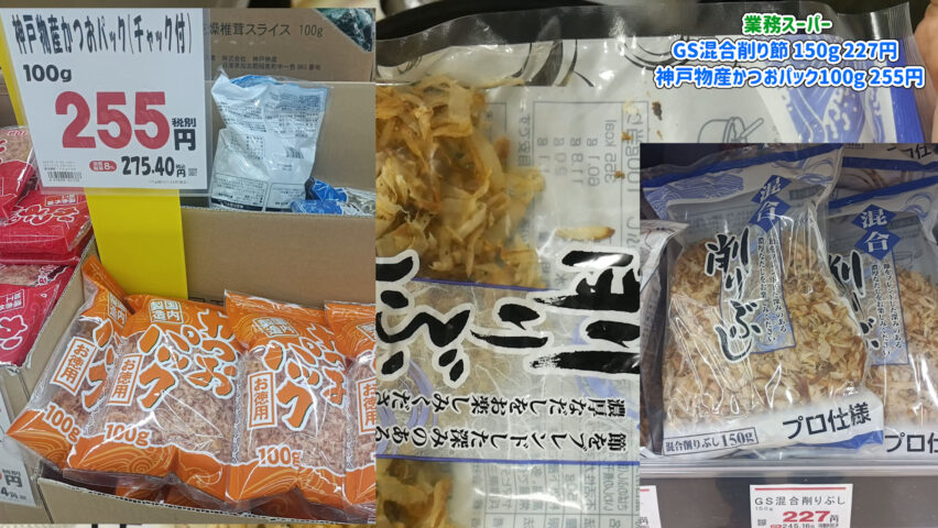 元々は左に神戸物産かつおパック(チャック付き) 100g 255円を買いに行ったのですが、その時は見当たらなかったので右のGS混合削りぶし150g 227円を買ってきました。