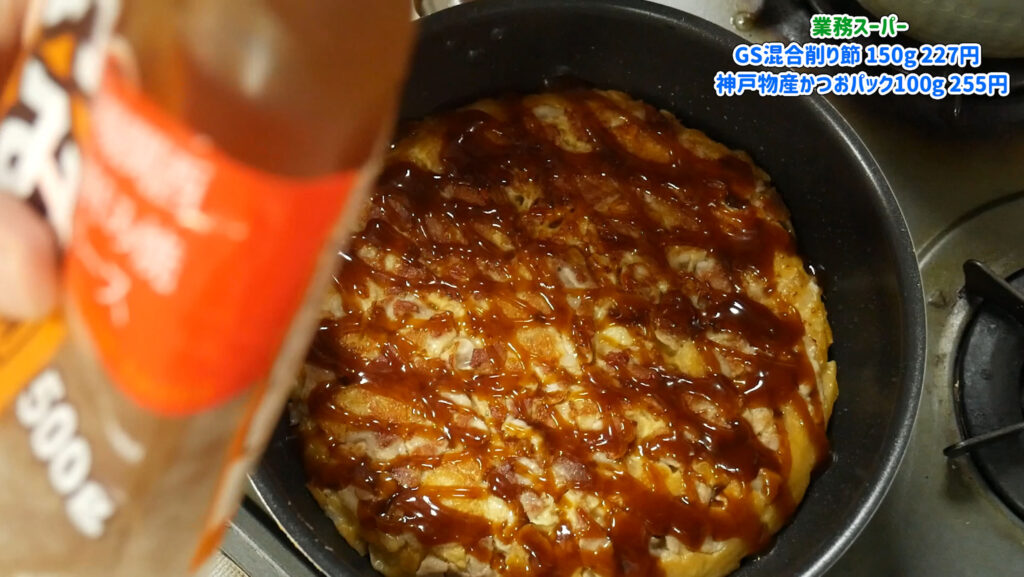 6分経ったら業務スーパーの「お好み焼きソース」と「マヨネーズ」をかけます