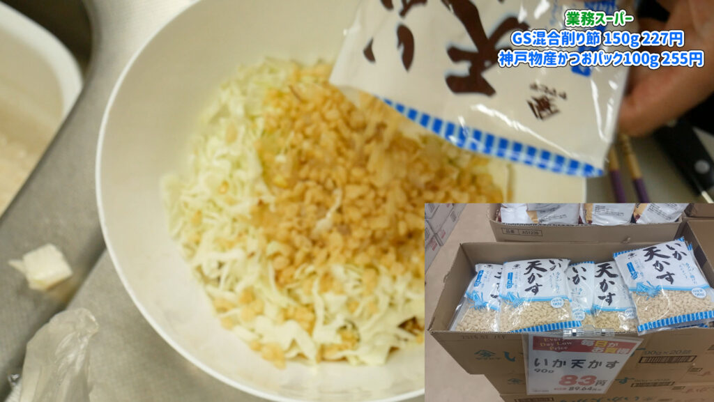 業務スーパーのいか天かす83円をボウルに追加します、エビ天かすよりイカ天かすの方が使い勝手がいいと思います。