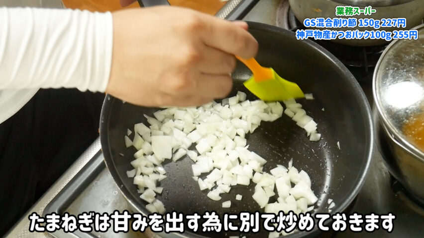 しっかり炒めて甘くなったタマネギが冷めたらボウルに入れます