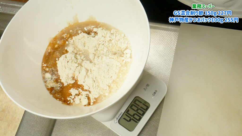 それに対してかつお出汁と水併せて250g程度を入れます(4:5)