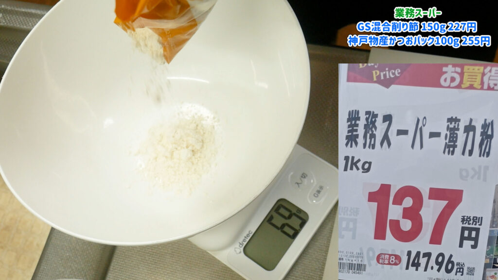 まずは、業務スーパーの薄力粉 1kg 137円を200gをボウル出します