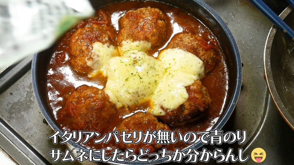 パスタでは使いきれないし同じ味のパスタがずっと続くのがきついのでチーズ煮込みハンバーグを作ります、ミートボールとも言えますが