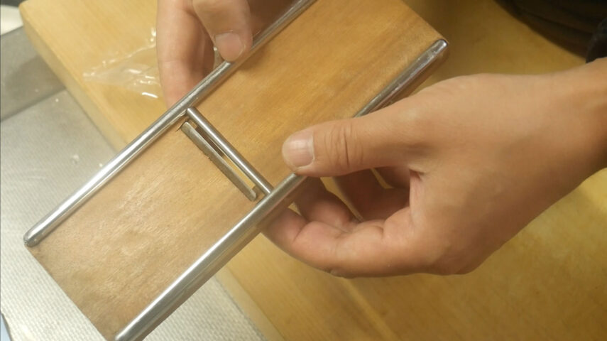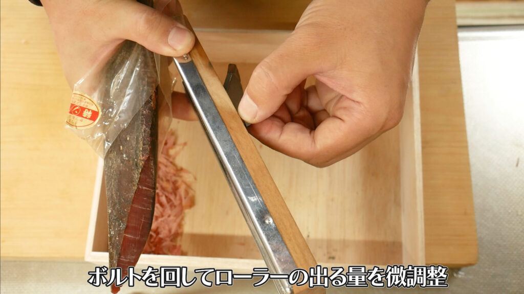 ローラーがボルトによって上下する事で刃の当たる深さが変わります、それにより薄く削れるのです