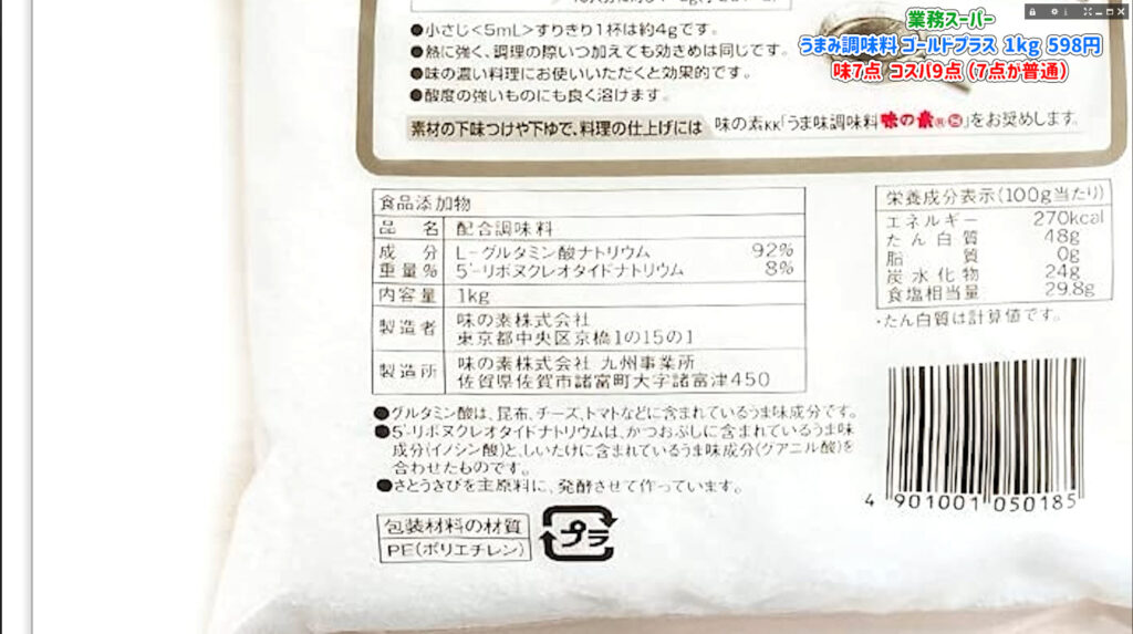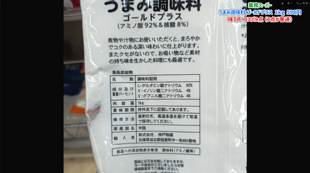 実際に使ってみると、理論上は旨味がアップしているはずなので安心感があります。 同じような成分のハイゴールドはインドネシア産ですが、業務スーパーのものはさらに価格が抑えられています。 コスパを重視して美味しいものを作りたいなら、このゴールドプラス一択と言っても過言ではありません。 もし今お使いのうま味調味料が切れるタイミングなら、ぜひ一度試してみてください。 1キロという大容量なので、一度買えば当分は困ることはありません。