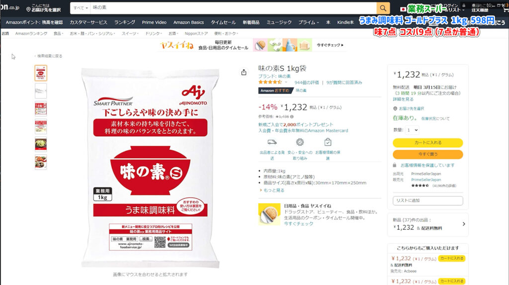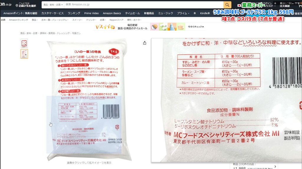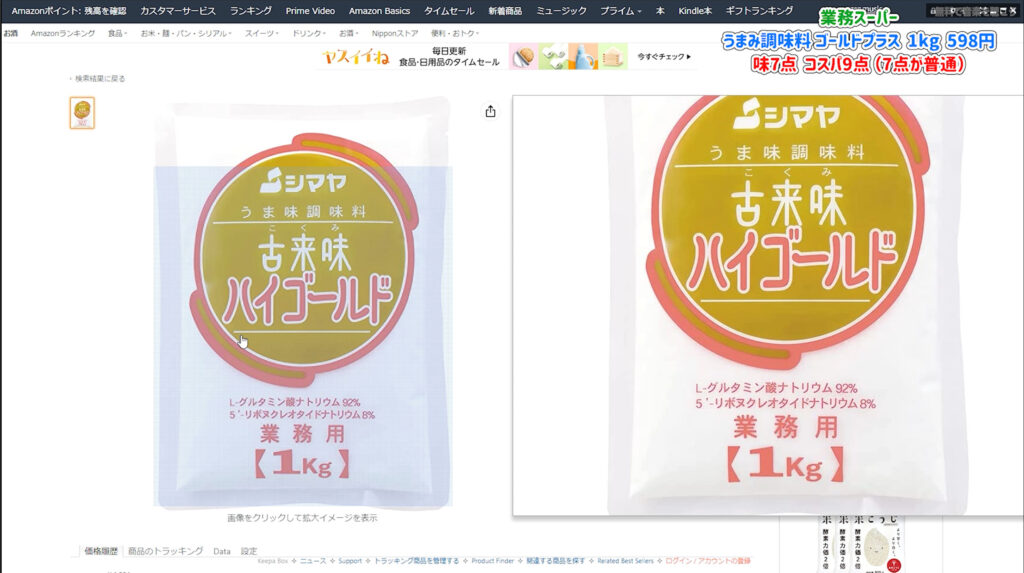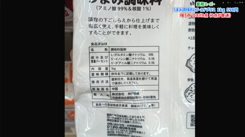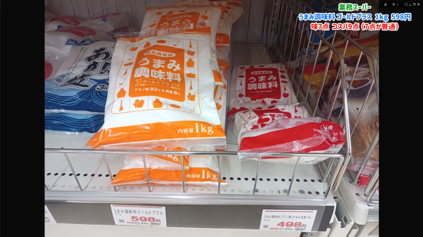 業務スーパーにはグルタミン酸99パーセントの標準的なタイプも498円で売っています。 しかし、わずか100円の差でハイミーと同じ配合のゴールドプラスが手に入るのは非常にお得です。 自炊の頻度が高い方や、大量に消費する方にとっては最高のパートナーになるでしょう。