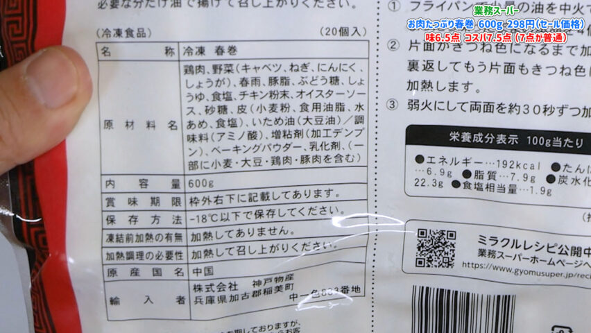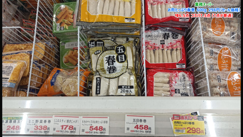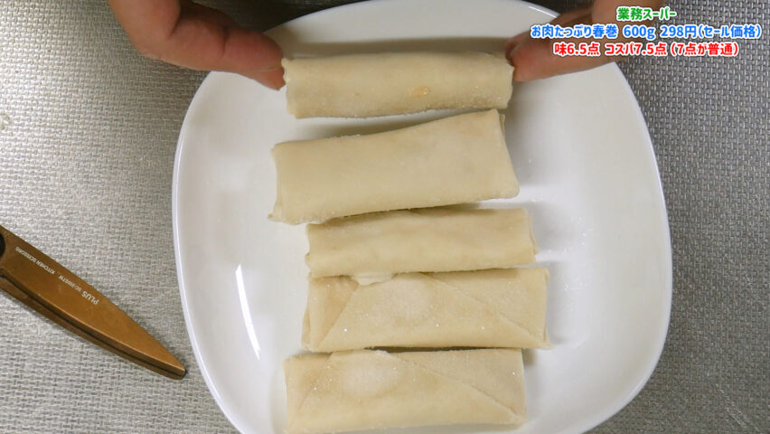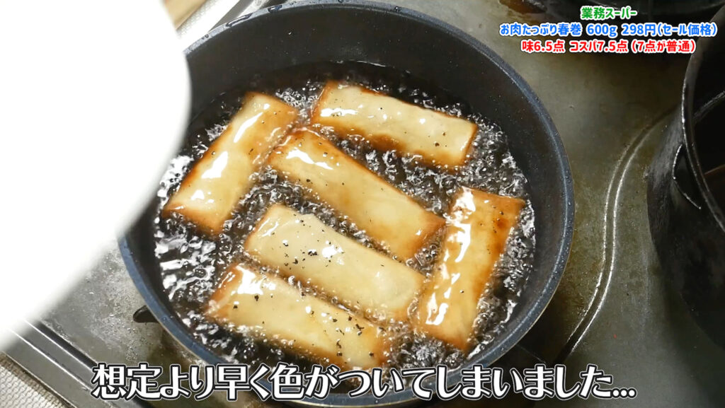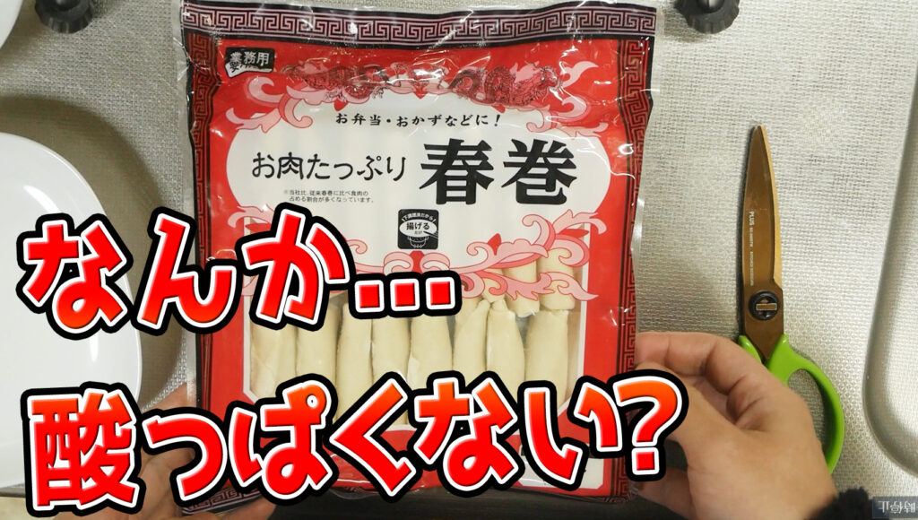 業務スーパーのお肉たっぷり春巻き 298円 業務スーパー X 2023.04.04 業務スーパーの冷凍はるまきが激安だったので買ってきました、歳末セールで30gが20本入って298円 豚脂が入っていますが豚肉は入っていません、鶏肉がベース 小さいフライパンだったからか焦がしてしまいました 材料はケチっている感じはしませんでしたがやけに酸味が強いです、豚肉の酸味を強くしたような感じでかなりマイナスです、原因が何かは分かりませんがリピートはないですね… 動画もよかったらご覧ください