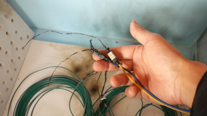 本来は土の中で使うような商品で被覆もそれほど強くないので、外で重なって発熱していたら被覆が溶けて導線がショートし抵抗も少なくなり発熱発火してスタイロフォームとケイカル版を焦がしたり溶かしたりした様です