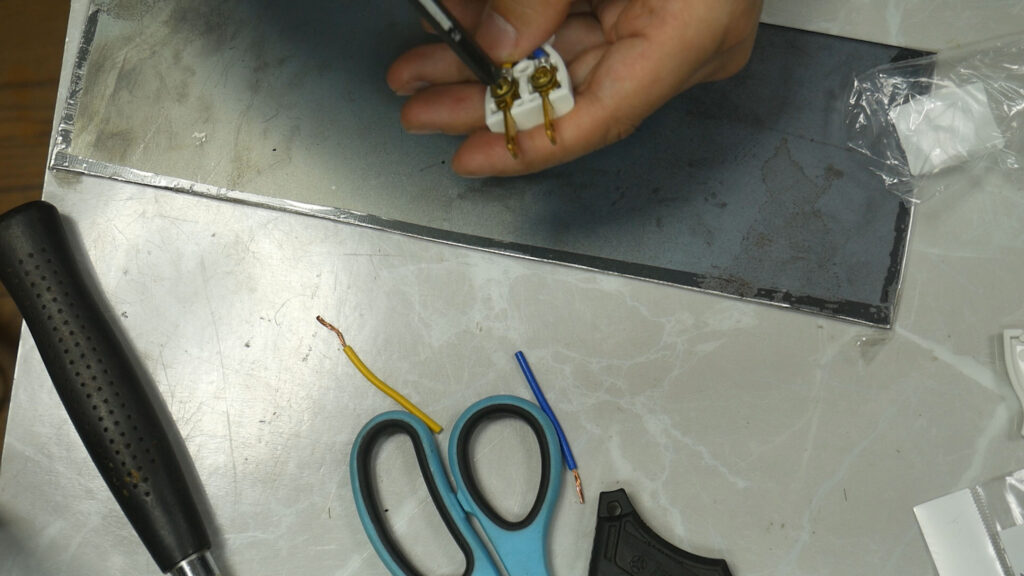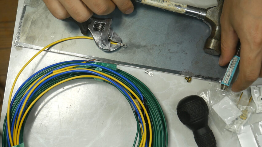 ケーブルのカシメも工具が無いのでトンカチとポンチでやってます