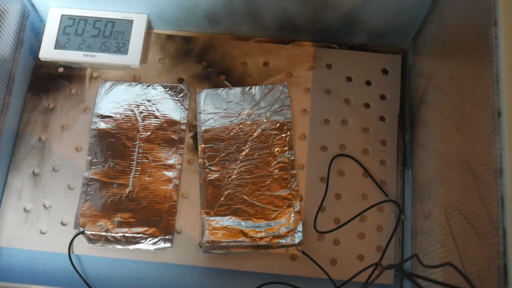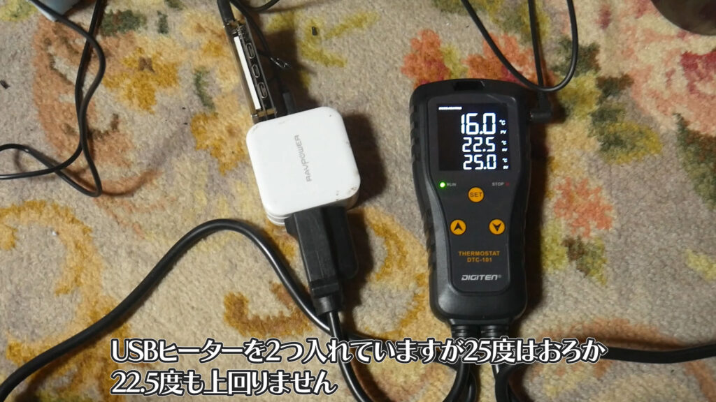 この後ショートで農電ケーブルが焼き切れてしまったので試しに8WのUSBヒーターを2枚使って試してみましたが