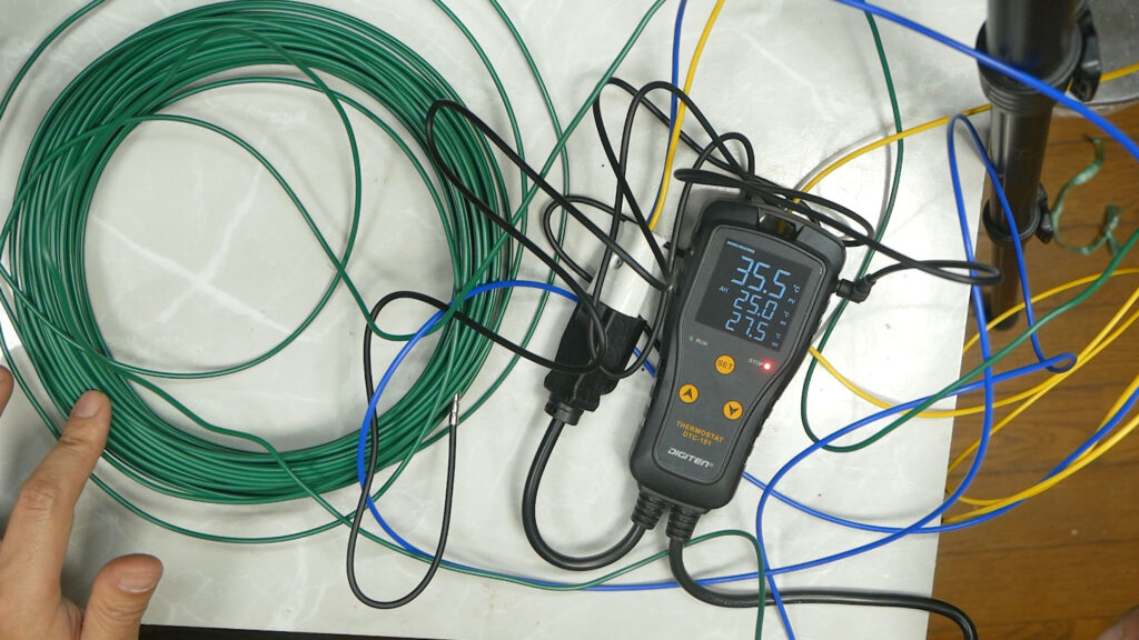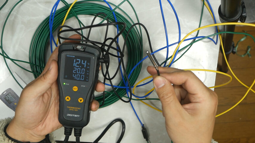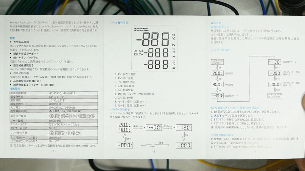 この画面は現在19.6℃(センサーが農電ケーブルに潜り込んでいる)で、25.0℃以下でヒーターがON、27℃でSTOPになっています、写っていませんが35℃以上と5℃以下でアラームが鳴る設定になっています、電源が供給されている時はRUNの緑のランプが点灯します