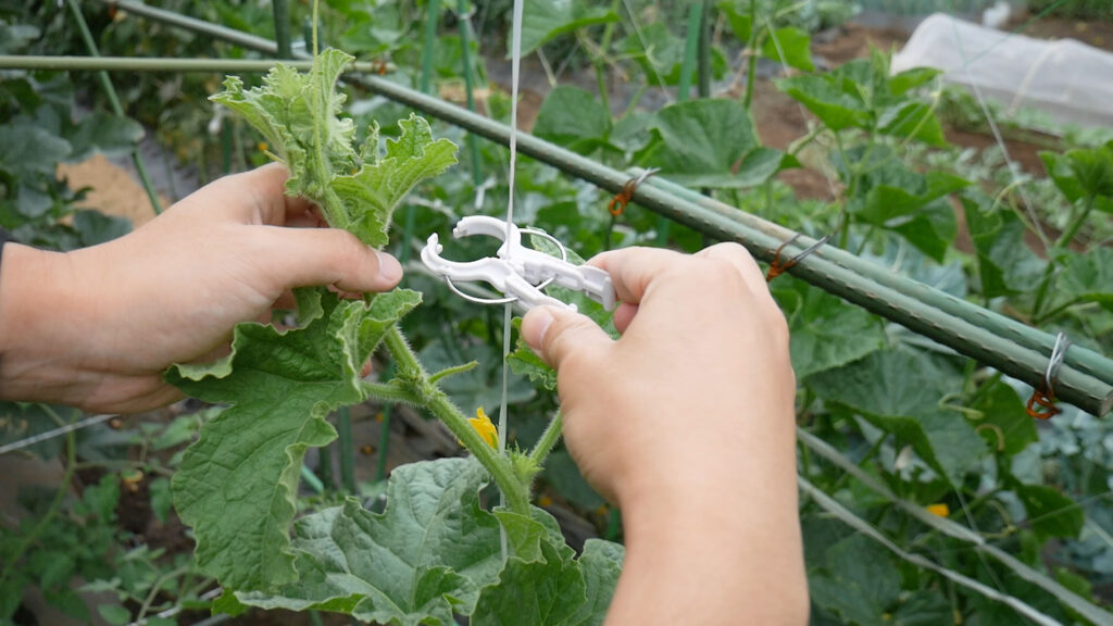 これはメロンの立体栽培(空中栽培)での成長点をくきタッチで誘引紐に誘引しているところです