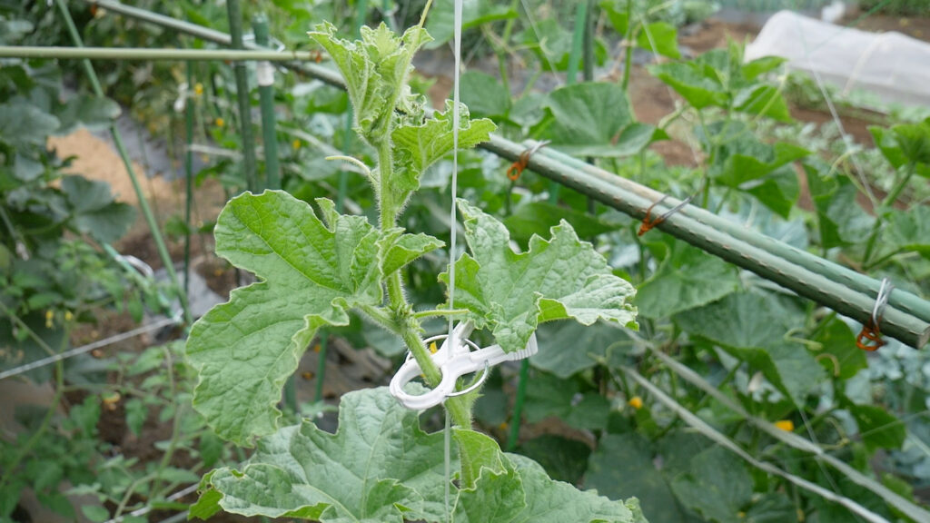 色々考えると、成長点だけくきタッチで誘引してそこから下は巻きつけたり縛ったりするのが一番いいと思います(メロンはそうしました)