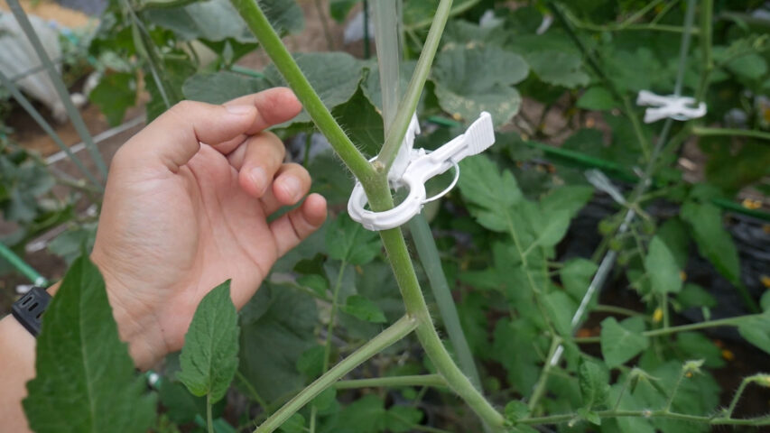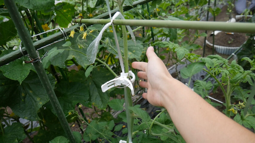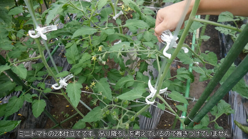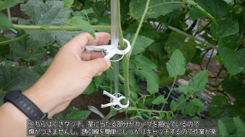 色々考えると、成長点だけくきタッチで誘引してそこから下は巻きつけたり縛ったりするのが一番いいと思います(メロンはそうしました)