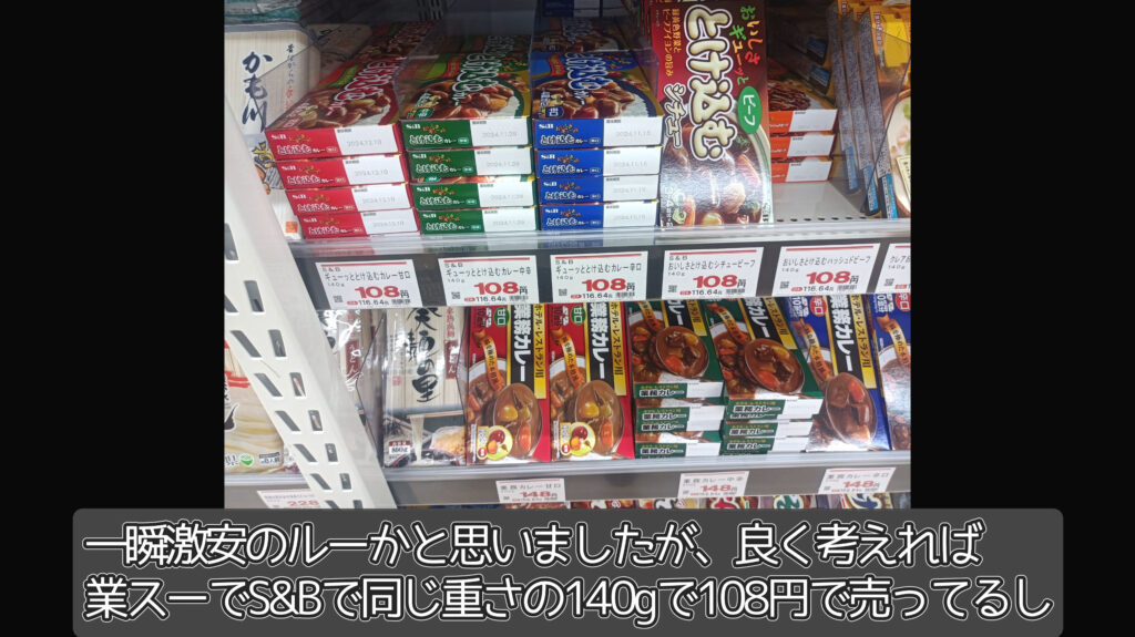 改めて考えると、100円のルーが激安のあやしい商品化かというと、業務スーパーでは同じS&B(エスビー)の「ギューッととけ込むカレー」が同じく140gで108円ですし