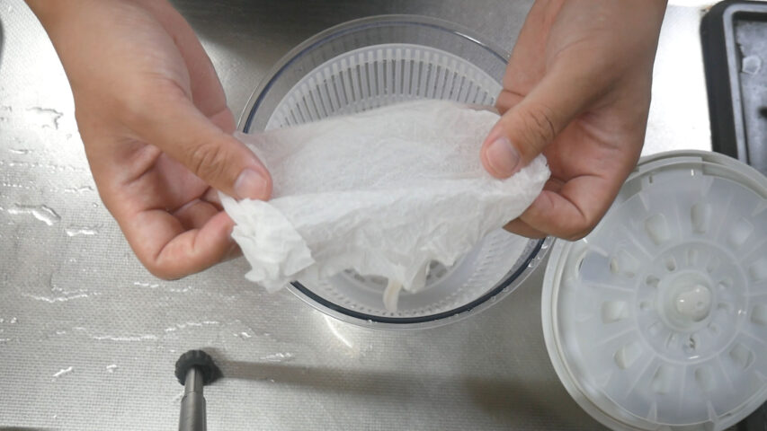 水で濡らしたキッチンペーパーを入れて回してみます