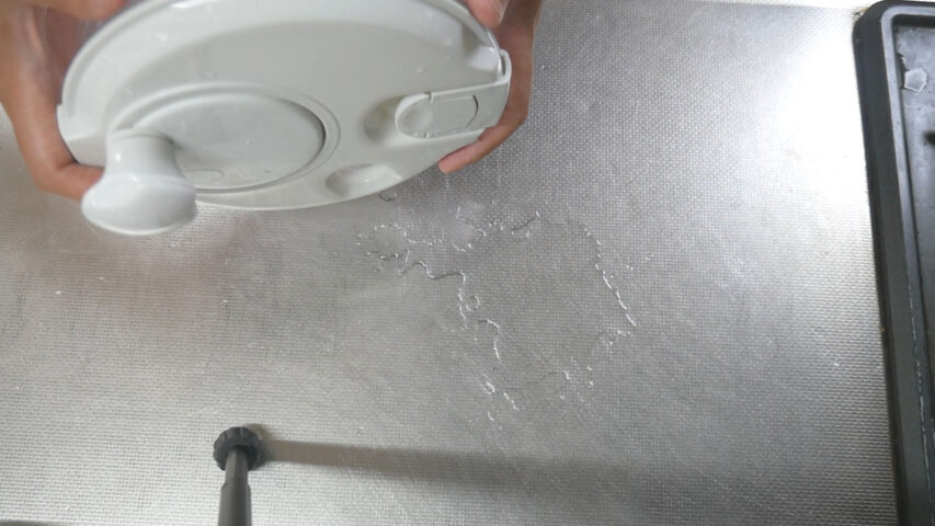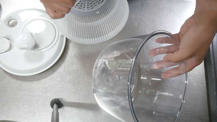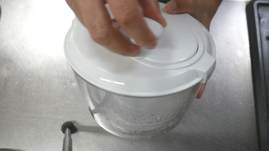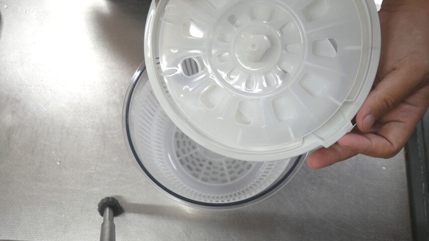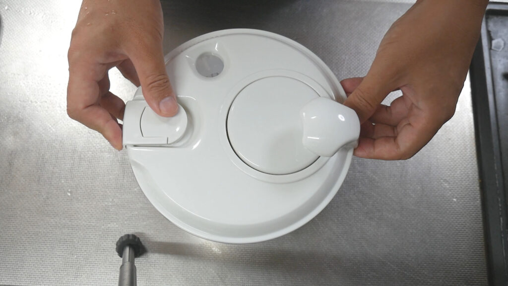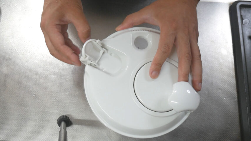 蓋の仕方は、左手の人差し指で触っている部分を下のボウルに引っ掛けて