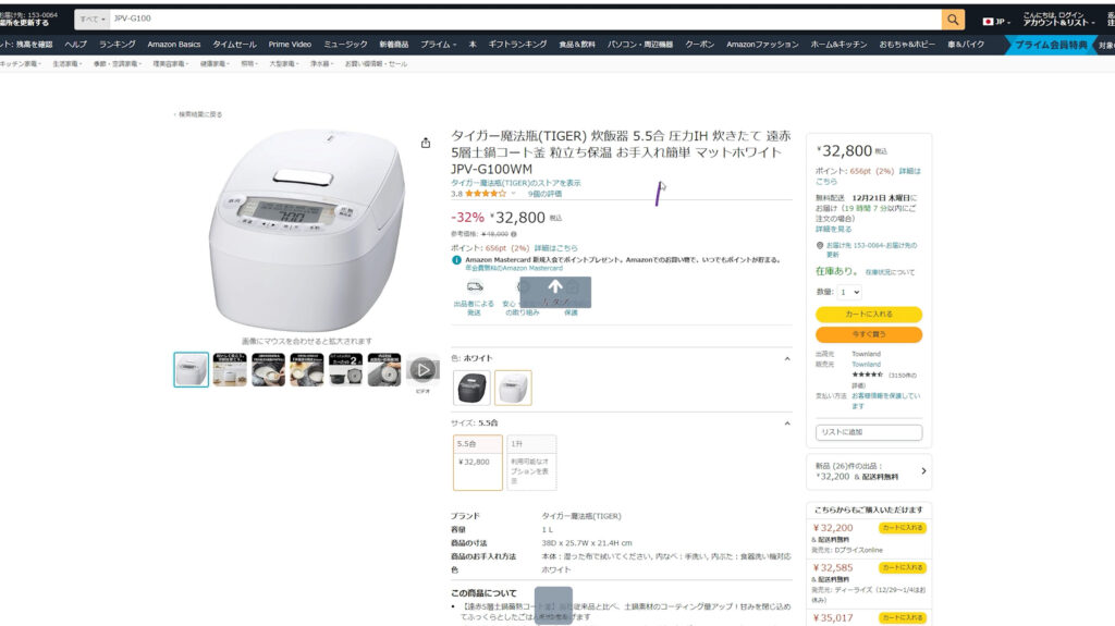 2023年の今年、去年の2022年モデルのJPV-A100というモデルの炊飯器を買いました、このモデルからフルモデルチェンジで長期保温でも味が落ちなくなっていたからです、今年のモデルである2023年モデルのタイガー魔法瓶 炊きたて JPV-G100も一部の見た目だけを変えたマイナーチェンジなので基本性能は変わっていません、ですから値段もほぼ変わりません。