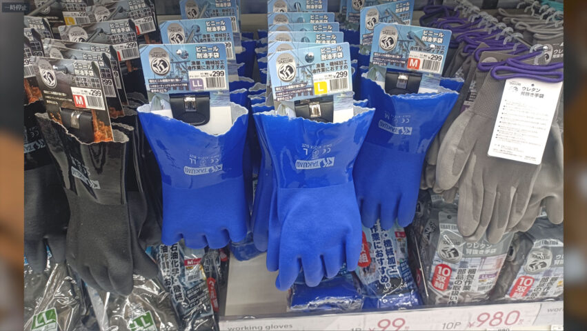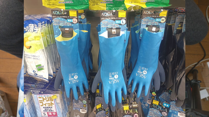 他にはワークマンでAQUAと書いてある防水のゴム手袋が有ります、こちらは私の手にはLLでも少しきつかったので平均身長位の男性だとLLやLが合うかもしれません、ただ厚みや触覚はSHOWAの厚手と同じか厚いくらいだったと思います。