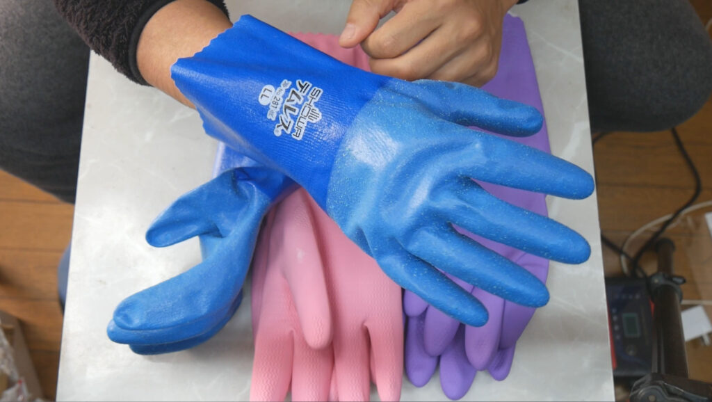 こちらはamazonで購入したLLサイズのゴム手袋、ホームセンターのLサイズが小さくてLLを買ったら大きすぎてこの時点でホームセンターの商品がレディースサイズという事に気づきました、ちなみにこの商品厚手となっていますがこの後紹介するSHOWAの厚手よりも薄いです。