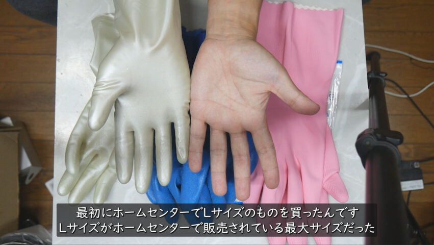こちらがお勧めするゴム手袋2つの内の1つ、SHOWAの厚手のゴム手袋でLサイズでピッタリフィットするわけではありませんが色々考えると一番適正なサイズと言えます。