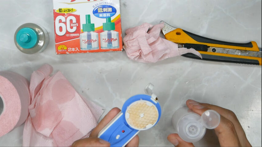 結局殺虫成分が拡散すればいいのならという事で手持ちのノーマットの薬剤を耐アルコール容器に一旦移し、それを定期的にパッド部分に染み込ませるという方法を考えました。