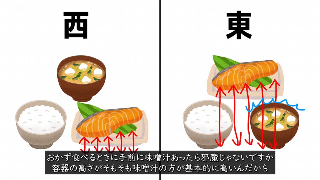 ご飯や味噌汁の置き方も東日本と西日本で違いがありますが西日本の方が合理的なので西日本派です、なぜしょうもないマナーに付き合う人がいるのか分かりません。
