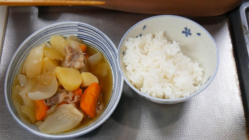 ちょうど牛肉が余っていたので牛肉で作ってみましたが非常に美味しいです、「どっちが美味しいのか?」という話は大体「どっちも良い」という結論になる事がほとんどですが、牛肉で作った肉じゃがを「美味しくない」という人は殆どいないと思いますが豚肉で作った肉じゃがを美味しくないという西日本人は多くいると思います、という事で軍配を牛肉の肉じゃがにあげさせて頂きます。