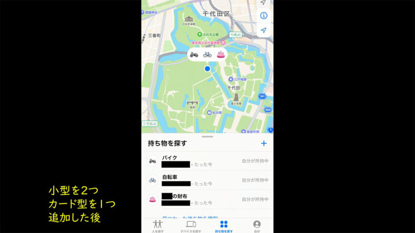ボタン電池の小型タイプや充電して繰り返し使えるカードタイプを追加した後が下の画像です、分かりやすいように皇居の地図で合成しています、同じ場所に3つあるのでまとまって表示されています。